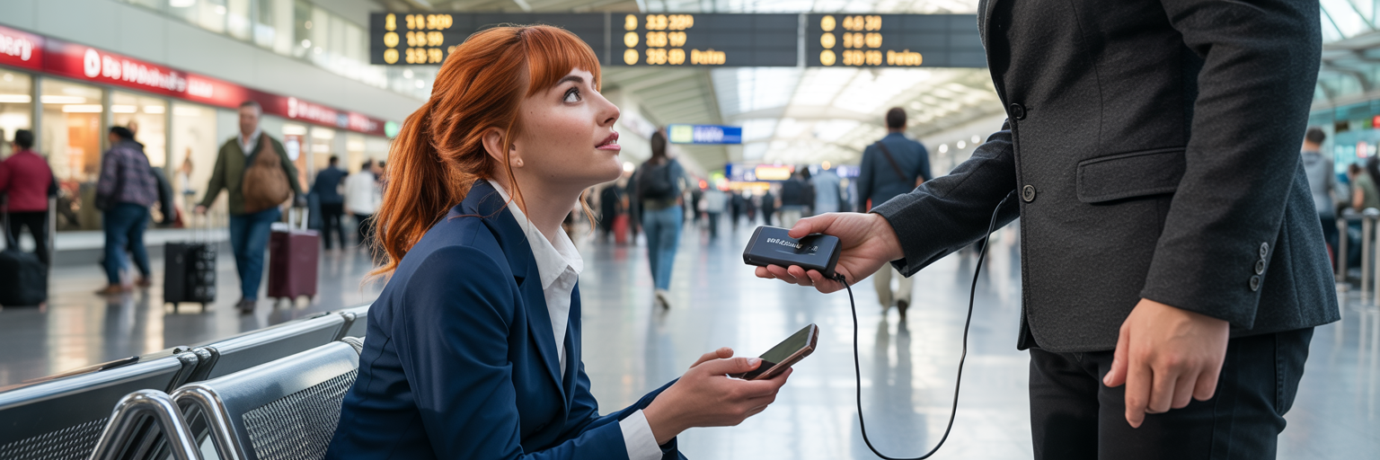 Знакомая сидела в аэропорту, готовясь к важному звонку — сделка на круглую сумму тогда была. Так вышло, что всё зависело от этого разговора. Но телефон на 2%. У нее паника: нет розеток, нет зарядки (не помню в какой стране это было, но, по ее словам, там не было даже кафешек).